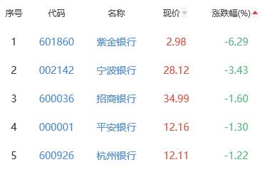 紫金银行、宁波银行、招商银行、平安银行、杭州银行位列涨幅榜后五位,涨幅分别为-6.29%、-3.43%、-1.60%、-1.30%、-1.22%。