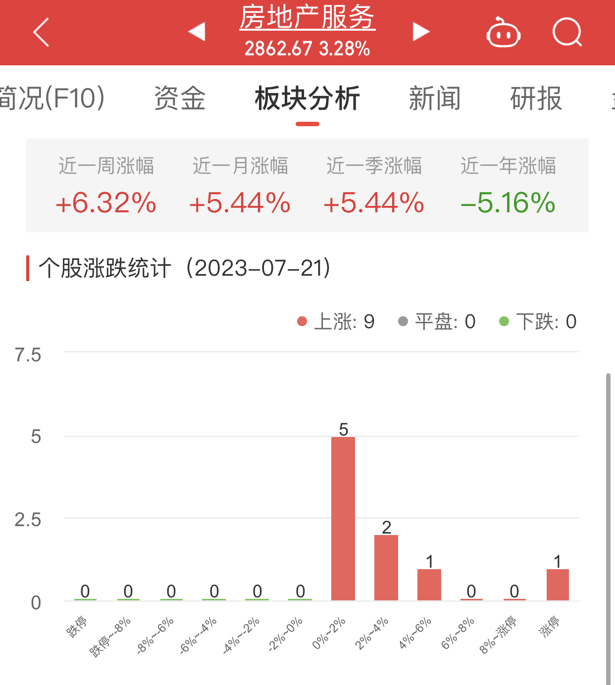 中国经济网北京7月21日讯 今日,房地产服务板块整体涨幅3.28%,其中9只股票上涨。