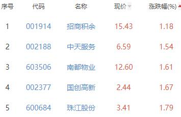 招商积余、中天服务、南都物业、国创高新、珠江股份位列涨幅榜后五位,涨幅分别为1.18%、1.54%、1.61%、1.67%、1.79%。