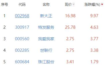 其中,新大正、特发服务、我爱我家、世联行、珠江股份位列板块涨幅前五位,涨幅分别为9.97%、4.63%、3.77%、3.38%、1.79%。