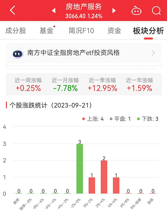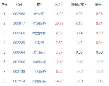 其中,新大正、特发服务、我爱我家、世联行、珠江股份、南都物业、中天服务、招商积余涨幅分别为4.08%、3.16%、3.14%、1.45%、0.00%、-0.48%、-0.64%、-0.81%。