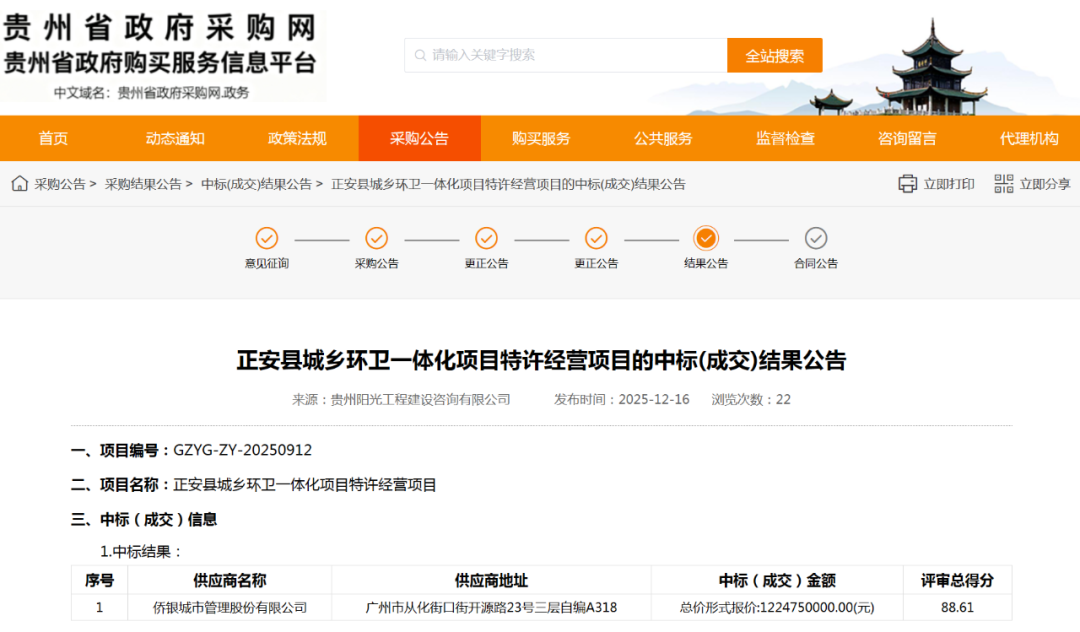 贵州省政府采购网消息,12月16日,侨银股份[002973]“收官战”成功打响,以12.25亿元报价中标正安县城乡环卫一体化项目特许经营项目,成交情况如下: