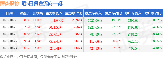10月30日的资金流向数据方面,主力资金净流入1.04亿元,占总成交额29.92%,游资资金净流出6825.6万元,占总成交额19.61%,散户资金净流出3590.81万元,占总成交额10.32%。