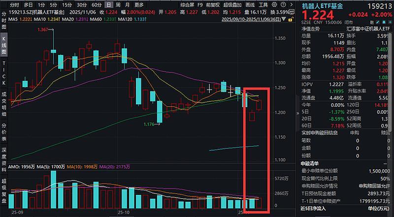 11月6日,A股市场震荡上行,硬科技板块强劲反弹,小鹏今日重磅发布全新一代人形机器人IRON吸睛无数,机器人板块大涨,$机器人ETF基金(159213)再度收涨2%,喜提两连阳。资金持续布局“未来科技高地”机器人板块,$机器人ETF基金(159213)近5日有4日获资金净流入,累计吸金超1200万元。
