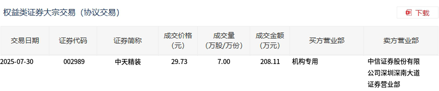 中天精装今日大宗交易折价成交7万股,成交额208.11万元