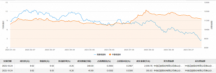10月24日大宗交易成交393.69万股,成交额3393.59万元,占当日总成交额的30.2%,成交价8.62元,较市场收盘价折价9.26%。