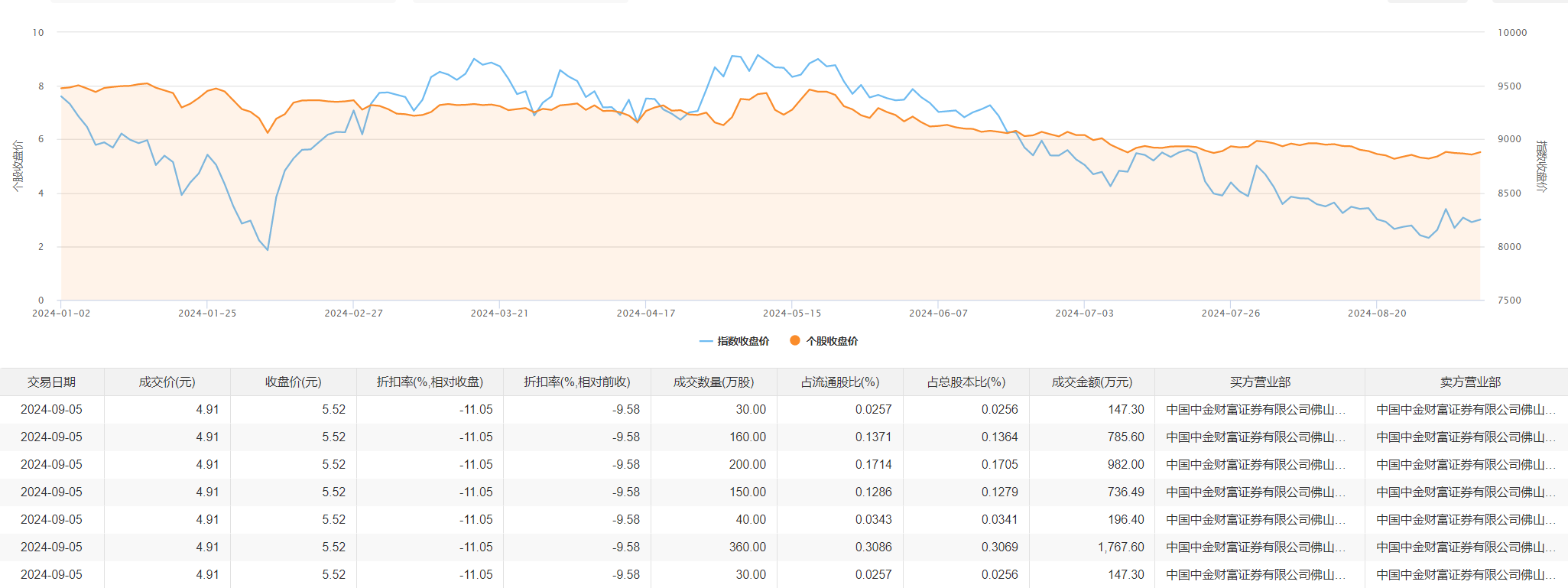 9月5日大宗交易成交970万股,成交额4762.69万元,占当日总成交额的60.8%,成交价4.91元,较市场收盘价5.52元折价11.05%。