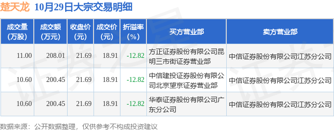 10月29日楚天龙现3笔折价12.82%的大宗交易 合计成交608.91万元