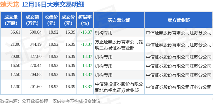 12月16日楚天龙现6笔折价13.37%的大宗交易 合计成交1948.95万元