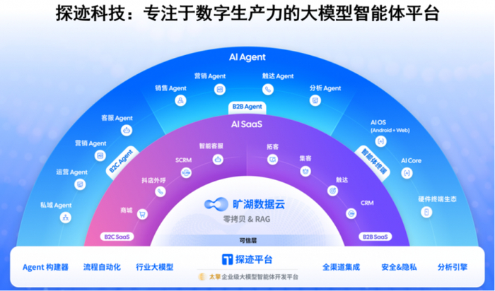 近期,一则收购消息引起市场的广泛关注:原本从事毛毯制造和销售的真爱美家股价连续暴涨,只因其确认将被探迹科技收购。据了解,探迹科技的发展路径十分垂直。早期聚焦销售效率,围绕企业寻求潜在客户等需求打造“探迹拓客”等产品。在“Agent元年”来临前,凭借行业经验与AI技术,成功建立三个垂直场景应用:面向B2B领域销售方向的智能体、面向B2C领域运营方向的智能体以及智能体终端生态。