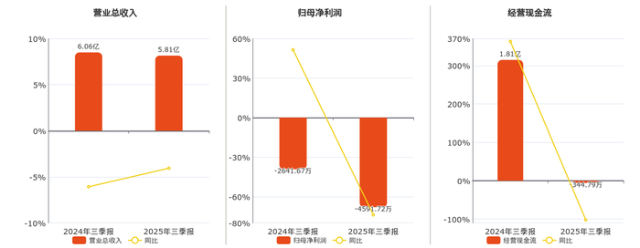 公司营业总收入为5.81亿元,较去年同报告期营业总收入减少2458.15万元,同比较去年同期下降4.06%。归母净利润为-4591.72万元,较去年同报告期归母净利润减少1950.05万元。经营活动现金净流入为-344.79万元,较去年同报告期经营活动现金净流入减少1.85亿元,同比较去年同期下降101.90%。