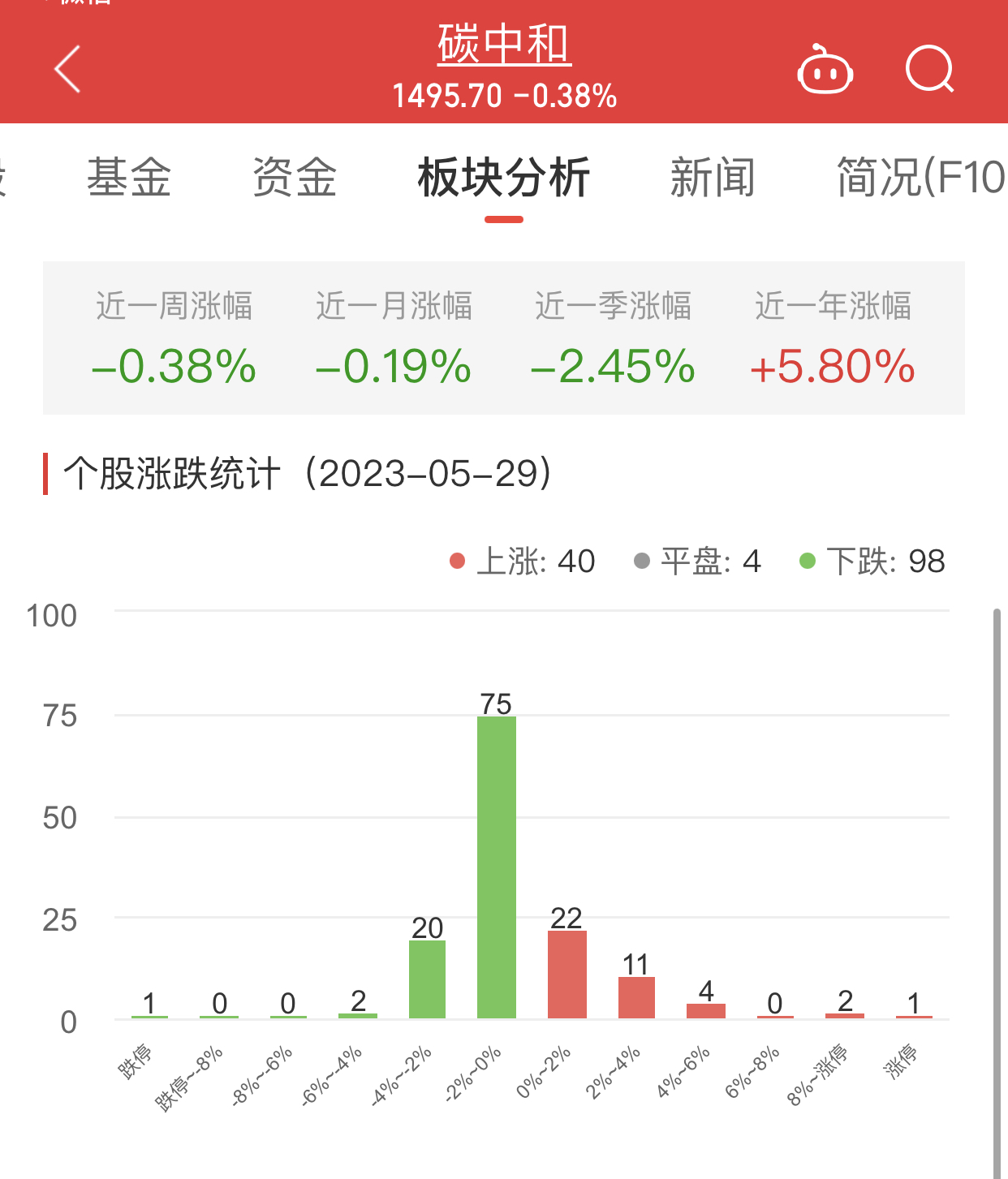 中国经济网北京5月29日讯 今日,碳中和板块整体跌幅0.38%,其中40只股票上涨,4只股票平盘,98只股票下跌。