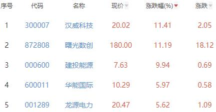 其中,汉威科技、曙光数创、建投能源、华能国际、龙源电力位列板块涨幅前五位,涨幅分别为11.41%、11.19%、9.94%、5.97%、5.62%。