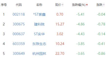 *ST紫鑫、建科院、ST实化、东珠生态、杭州园林位列涨幅榜后五位,涨幅分别为-5.41%、-4.86%、-4.43%、-3.85%、-3.65%。