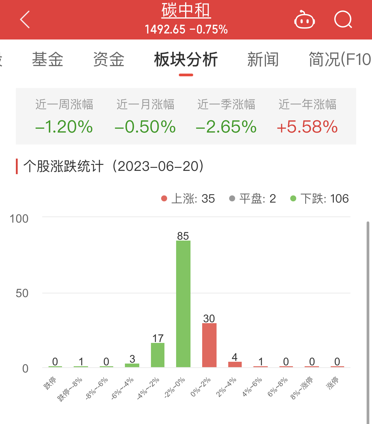 中国经济网北京6月20日讯 今日,碳中和板块整体跌幅0.75%,其中35只股票上涨,2只股票平盘,106只股票下跌。