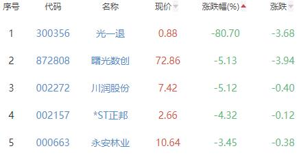 光一退、曙光数创、川润股份、*ST正邦、永安林业位列涨幅榜后五位,涨幅分别为-80.70%、-5.13%、-5.12%、-4.32%、-3.45%。