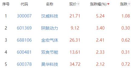 其中,汉威科技、陕鼓动力、金宏气体、双良节能、昊华科技位列板块涨幅前五位,涨幅分别为5.24%、3.40%、2.41%、2.33%、2.12%。
