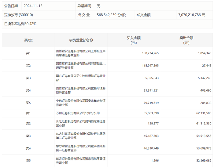 豆神教育今日涨停,龙虎榜数据显示,上榜营业部席位全天成交9.62亿元,占当日总成交金额比例为13.61%。其中,买入金额为6.71亿元,卖出金额为2.92亿元,合计净买入3.79亿元。