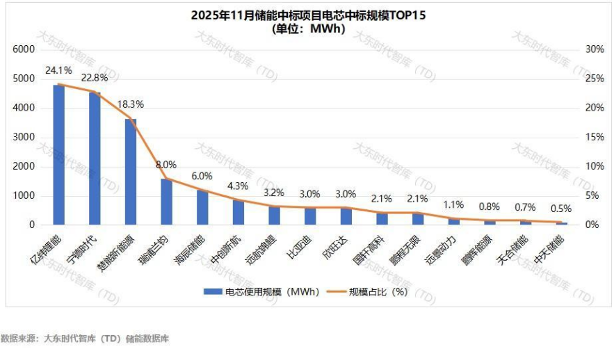 2025年11月中国储能中标项目(含电芯项目)电芯中标规模近20GWh,其中亿纬锂能、宁德时代电芯中标占比24.1%、22.8%,位居前二,楚能新能源占比18.3%,位列第三,中国市场储能电芯CR3为65.2%,CR5为79.2%。