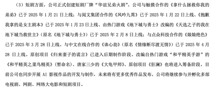短剧方面,公司正式创建短剧厂牌“华谊兄弟火剧”。公司与触摸合作的《拿什么拯救你我的 弟弟》已于2025年1月21日上线;与阅文集团合作的《凤吟九霄》已于2025年1月22日上线、《抱歉我拿的是女主剧本》已于2025年1月23日上线、由热门游戏《地下城与勇士》改编的《天选之子的我在地下城当救世主》(原名《地下城与勇士》)已于2025年2月8日上线;与点众科技合作的《娘娘绝色》已于2025年3月28日上线等。