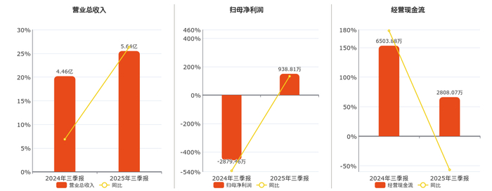 公司营业总收入为5.64亿元。归母净利润为938.81万元。经营活动现金净流入为2808.07万元,较去年同报告期经营活动现金净流入减少3695.81万元,同比较去年同期下降56.82%。