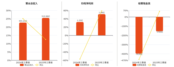 公司营业总收入为510.98亿元。归母净利润为1.96亿元。经营活动现金净流入为-3.65亿元,在已披露的同业公司中排名第20。