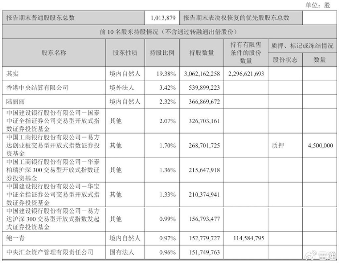 截至2025年6月30日,东方财富实控人其实持股为19.38%,香港中央结算有限公司持股为3.06%,其实的妻子陆丽丽持股为2.32%;