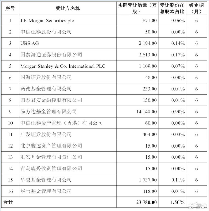 陆丽丽女士与沈友根此次减持中,一共有16名机构投资者入围,分别为J.P. Morgan Securities plc、中信证券股份有限公司、UBS AG、国泰海通证券股份有限公司、Morgan Stanley & Co. International PLC、国海证券股份有限公司、诺德基金管理有限公司、国泰君安金融控股有限公司、易方达基金管理有限公司、中信证券资产管理(香港)有限公司、广发证券股份有限公司、北京骏远资产管理有限公司、汇安基金管理有限责任公司、青岛鹿秀投资管理有限公司、华夏基金管理有限公司、华宝基金管理有限公司。