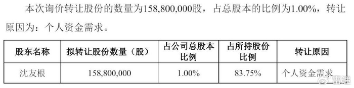 陆丽丽女士、沈友根此次一共转让23,780万股,占公司总股本的1.50%,转让价为24.40元/股,这意味着其实家族套现58亿元。