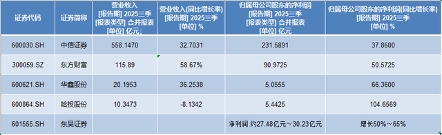 除了中信证券与东方财富外,华鑫股份(600621)与哈投股份(600864)也发布了2025年三季报。其中,华鑫股份前三季度的营业收入为20.20亿元,同比增加36.25%;净利润5.06亿元,同比增加了66.36%。