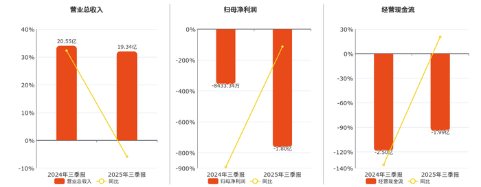 公司营业总收入为19.34亿元,在已披露的同业公司中排名第6,较去年同报告期营业总收入减少1.21亿元,同比较去年同期下降5.90%。归母净利润为-1.80亿元,在已披露的同业公司中排名第14,较去年同报告期归母净利润减少9567.82万元。经营活动现金净流入为-1.99亿元,在已披露的同业公司中排名第15,较去年同报告期经营活动现金净流入增加5138.87万元。