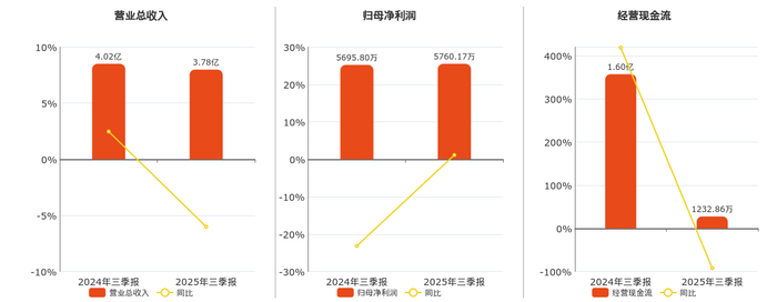公司营业总收入为3.78亿元,较去年同报告期营业总收入减少2417.39万元,同比较去年同期下降6.01%。归母净利润为5760.17万元。经营活动现金净流入为1232.86万元,较去年同报告期经营活动现金净流入减少1.47亿元,同比较去年同期下降92.28%。