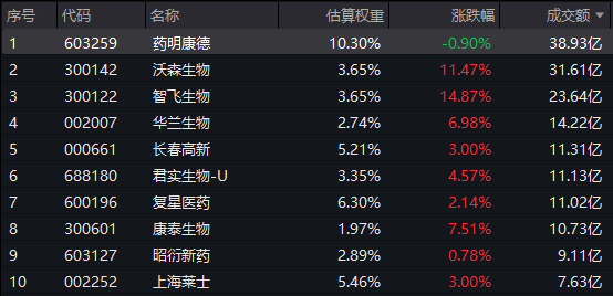 生物医药ETF汇添富(159839)标的指数热门成分股多数飘红:智飞生物涨近15%,沃森生物涨超11%,华兰生物涨近7%,君实生物-U涨超4%,长春高新涨3%。