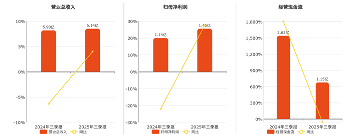 公司营业总收入为6.14亿元。归母净利润为1.45亿元。经营活动现金净流入为1.15亿元,较去年同报告期经营活动现金净流入减少1.47亿元,同比较去年同期下降56.02%。