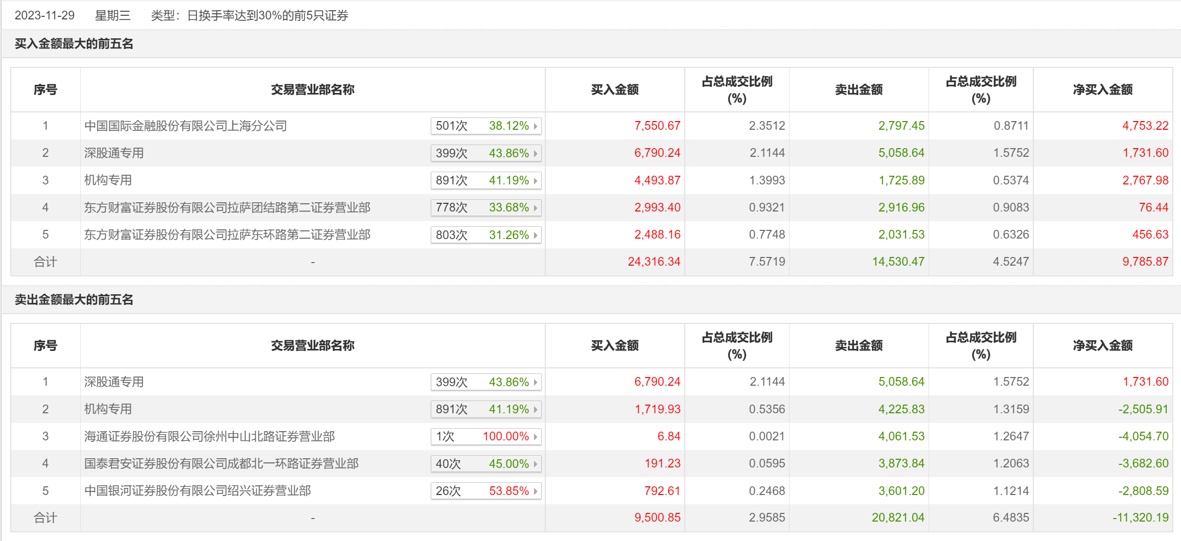 11月29日,英唐智控今日跌4.05%,龙虎榜数据显示,上榜营业部席位全天成交5.73亿元,占当日总成交金额比例为17.85%。其中,买入金额为2.7亿元,卖出金额为3.03亿元,合计净卖出3265.92万元。