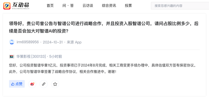 在互动平台表示,公司投资智谱华章1亿元,投资事项已于2024年8月完成,相关工商变更手续办理中,具体估值双方签有保密协议。此外,公司与智谱华章签署了战略合作协议,相关合作推进中。
