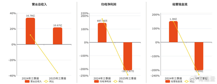 公司营业总收入为10.67亿元,较去年同报告期营业总收入减少6.11亿元,同比较去年同期下降36.42%。归母净利润为-1012.87万元,较去年同报告期归母净利润减少1710.34万元,同比较去年同期下降245.22%。经营活动现金净流入为-1.85亿元,较去年同报告期经营活动现金净流入减少3.23亿元,同比较去年同期下降234.00%。