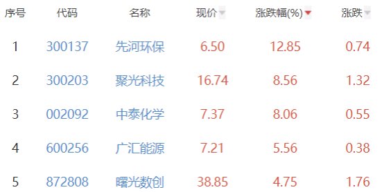 其中,先河环保、聚光科技、中泰化学、广汇能源、曙光数创位列板块涨幅前五位,涨幅分别为12.85%、8.56%、8.06%、5.56%、4.75%。