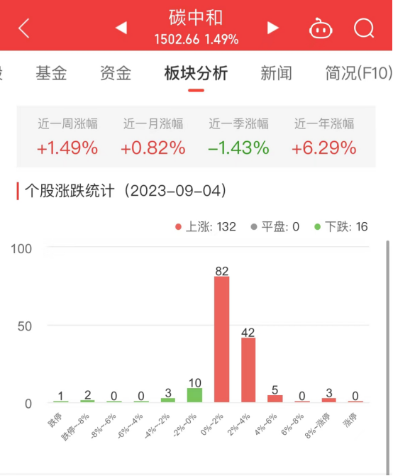 中国经济网北京9月4日讯今日,碳中和板块整体涨幅1.49%,其中132只股票上涨,16只股票下跌。