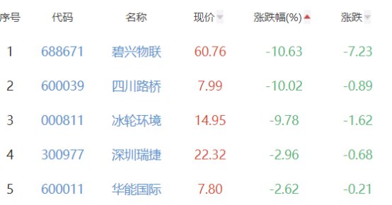 碧兴物联、四川路桥、冰轮环境、深圳瑞捷、华能国际位列涨幅榜后五位,涨幅分别为-10.63%、-10.02%、-9.78%、-2.96%、-2.62%。