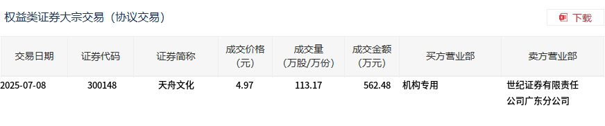 天舟文化今日大宗交易折价成交113.17万股,成交额562.48万元