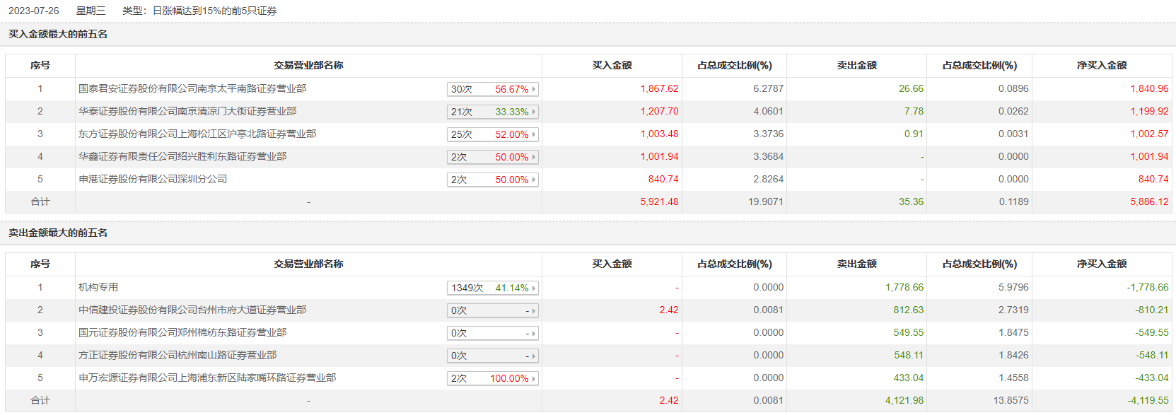 7月26日,安居宝今日涨停,龙虎榜数据显示,上榜营业部席位全天成交1.01亿元,占当日总成交金额比例为33.89%。其中,买入金额为5923.9万元,卖出金额为4157.33万元,合计净买入1766.56万元。