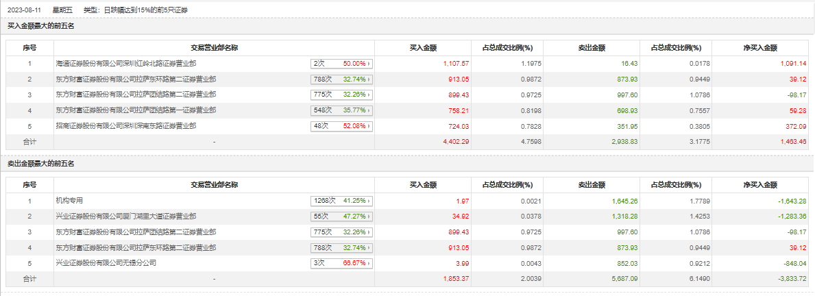 8月11日,天晟新材今日跌15.63%,全天换手率达36.1%,振幅达10.18%。龙虎榜数据显示,营业部席位合计净卖出2311.22万元。其中,机构买入1.97万元,卖出1645.26万元,合计净卖出1643.28万元。此外,兴业证券厦门湖里大道证券营业部、东方财富证券拉萨团结路第二证券营业部分别卖出1318.28万元、997.60万元;海通证券深圳红岭北路证券营业部、东方财富证券拉萨东环路第二证券营业部分别买入1107.57万元、913.05万元。