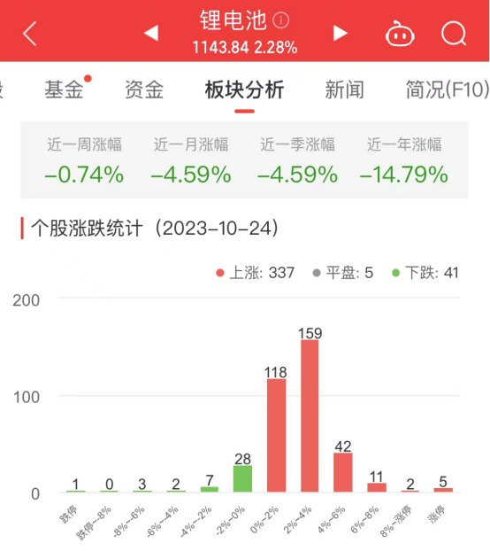 中国经济网北京10月24日讯今日,锂电池板块整体涨幅2.28%,其中337只股票上涨,5只股票平盘,41只股票下跌。