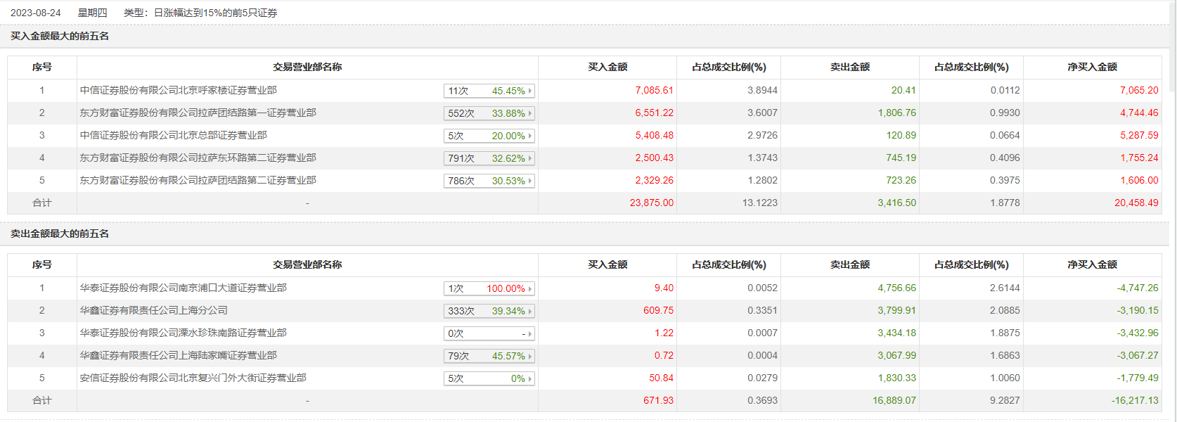 具体来看,中信证券北京呼家楼证券营业部、东方财富证券拉萨团结路第一证券营业部分别买入7085.61万元、6551.22万元;华泰证券南京浦口大道证券营业部、华鑫证券上海分公司分别卖出4756.66万元、3799.91万元。