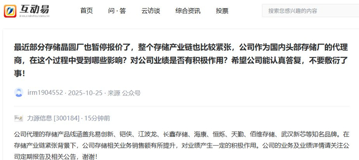深交所互动易平台截图【V观财报|力源信息:存储相关业务销售额有所提升】力源信息10月29日在投资者互动平台回复提问表示,公司代理的存储产品线涵盖兆易创新、铠侠、江波龙、长鑫存储、海康、恒烁、天勤、佰维存储、武汉新芯等知名品牌。在存储产业链紧张背景下,公司存储相关业务销售额有所提升,对业绩产生一定的积极作用。(中新经纬APP)