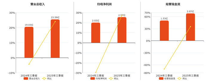公司营业总收入为23.59亿元。归母净利润为2.57亿元。经营活动现金净流入为2.07亿元,在已披露的同业公司中排名第6。