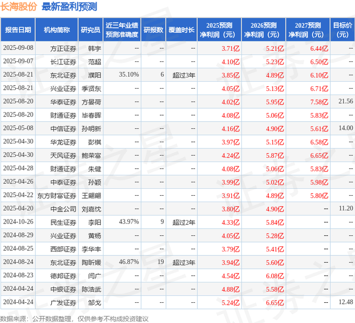 长海股份2025年三季报显示,前三季度公司主营收入23.59亿元,同比上升24.02%;归母净利润2.57亿元,同比上升27.16%;扣非净利润2.65亿元,同比上升45.54%;其中2025年第三季度,公司单季度主营收入9.04亿元,同比上升33.13%;单季度归母净利润8376.83万元,同比上升4.18%;单季度扣非净利润8757.99万元,同比上升33.18%;负债率36.4%,投资收益-1307.11万元,财务费用-84.22万元,毛利率23.69%。