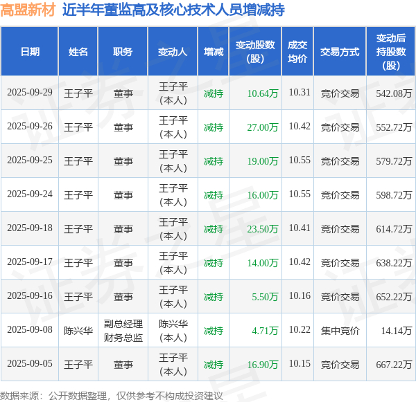 高盟新材:9月29日高管王子平减持股份合计10.64万股