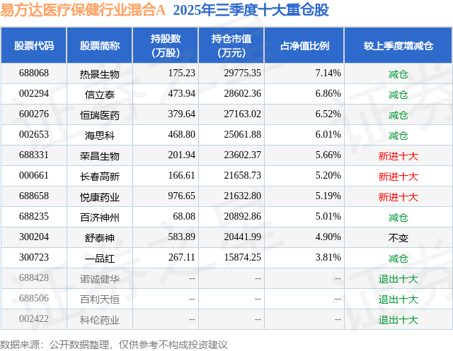 根据2025基金Q3季报公募基金重仓股数据,重仓该股的公募基金共19家,其中持有数量最多的公募基金为易方达基金的易方达医疗保健行业混合A。易方达医疗保健行业混合A目前规模为38.02亿元,最新净值4.273(11月14日),较上一交易日上涨0.42%,近一年上涨31.56%。该公募基金现任基金经理为杨桢霄。杨桢霄在任的基金产品包括:易方达全球医药行业混合发起式(QDII)A(人民币),管理时间为2020年1月20日至今,期间收益率为33.4%;易方达医药生物股票A,管理时间为2020年11月4日至今,期间收益率为-7.55%。